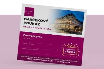 Potešte svojich milovaných a darujte im nezabudnuteľné chvíle v Hoteli KULTÚRA****. Vyberte si z našej ponuky pobytov alebo si vyskladajte darček na mieru podľa Vašich predstáv. Všetky zakúpené služby majú platnosť po celý rok 2023. Zážitok je ten najtrvácnejší dar. Veď práve spomienky s nami ostávajú navždy.